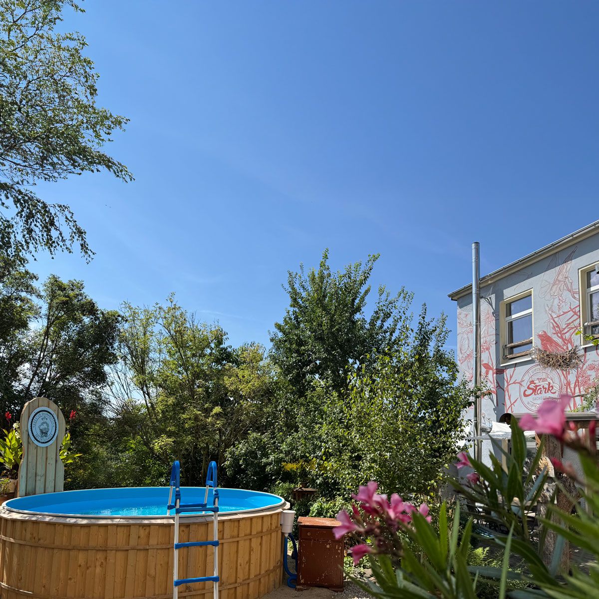 ferienwohnung, fitnessraum mit sauna, pool – der größte saunabottich des erzgebirges – und tischtennisplatte – im frühjahr, sommer und herbst – und bibliothek, 2000 quadratmeter großer gemeinschaftsgarten, sonnenterrasse mit liegen, grill- und lagerfeuerecke …